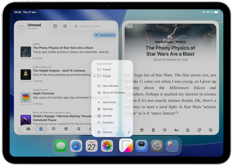 - Multi-window support: On macOS and iPadOS, you can now open multiple independent Flyleaf windows at once. There is also a new context menu option to open an article in a new window (or Command-click on macOS).