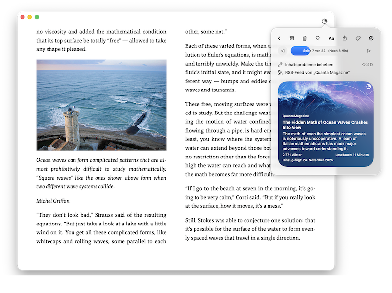 Also new and dear to my heart is the introduction of a proper full-screen mode on macOS 26 (and on iOS when pagination is disabled). In full-screen mode, the article toolbar will be completely hidden except for a small progress indicator. On tap, it reveals article details and controls.