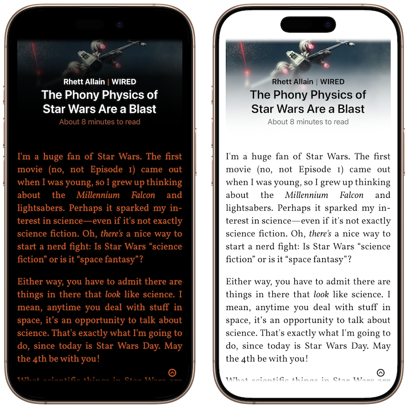 Also new and dear to my heart is the introduction of a proper full-screen mode on macOS 26 (and on iOS when pagination is disabled). In full-screen mode, the article toolbar will be completely hidden except for a small progress indicator. On tap, it reveals article details and controls.